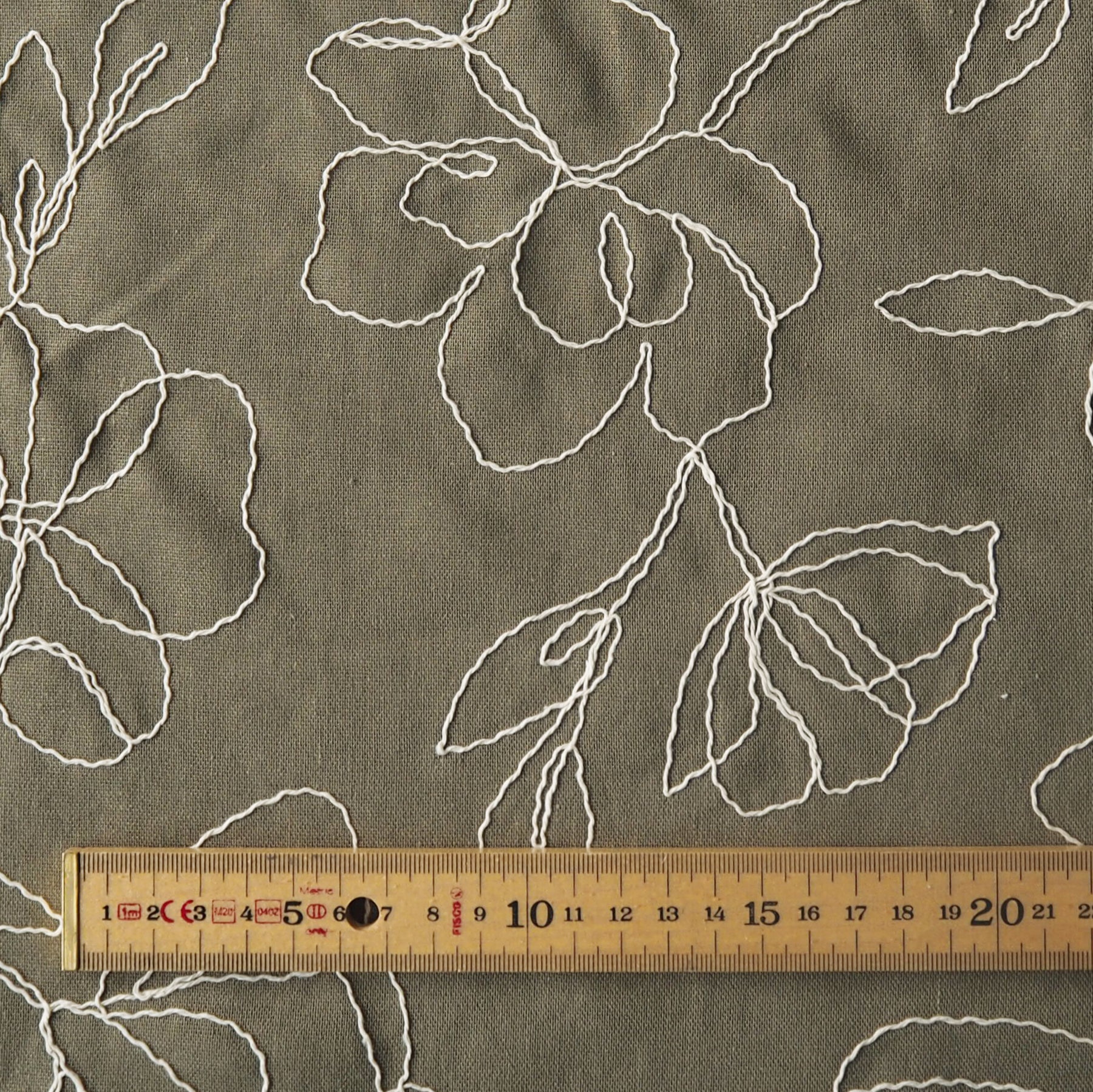 An off-white embroidered floral design sits against a khaki green base creating a subtle yet decorative finish that enhances the fabric’s natural texture.