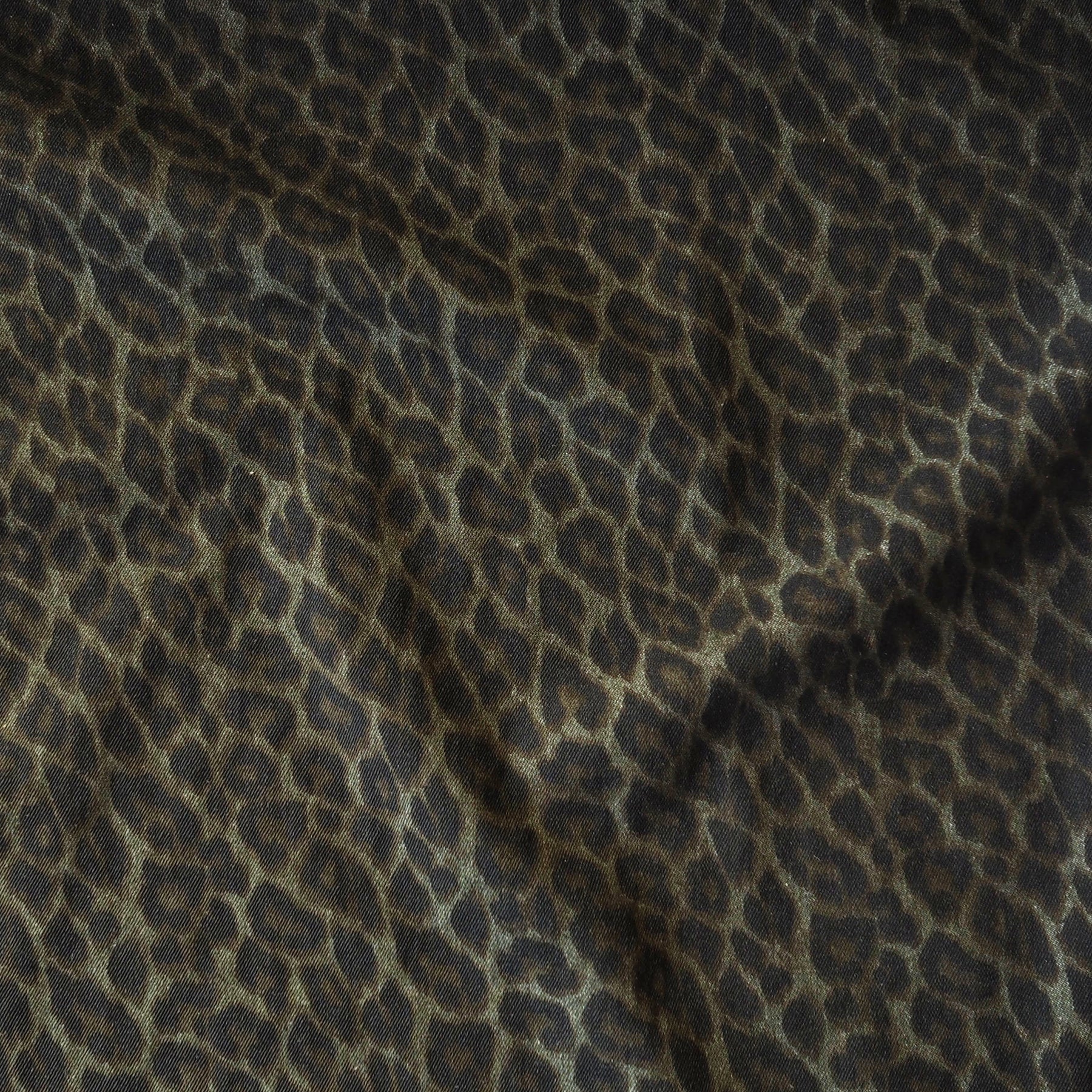 This Olive Leopard Print Rigid Cotton Denim is a durable and eye-catching dressmaking fabric, ideal for sewing jeans, jackets and skirts.