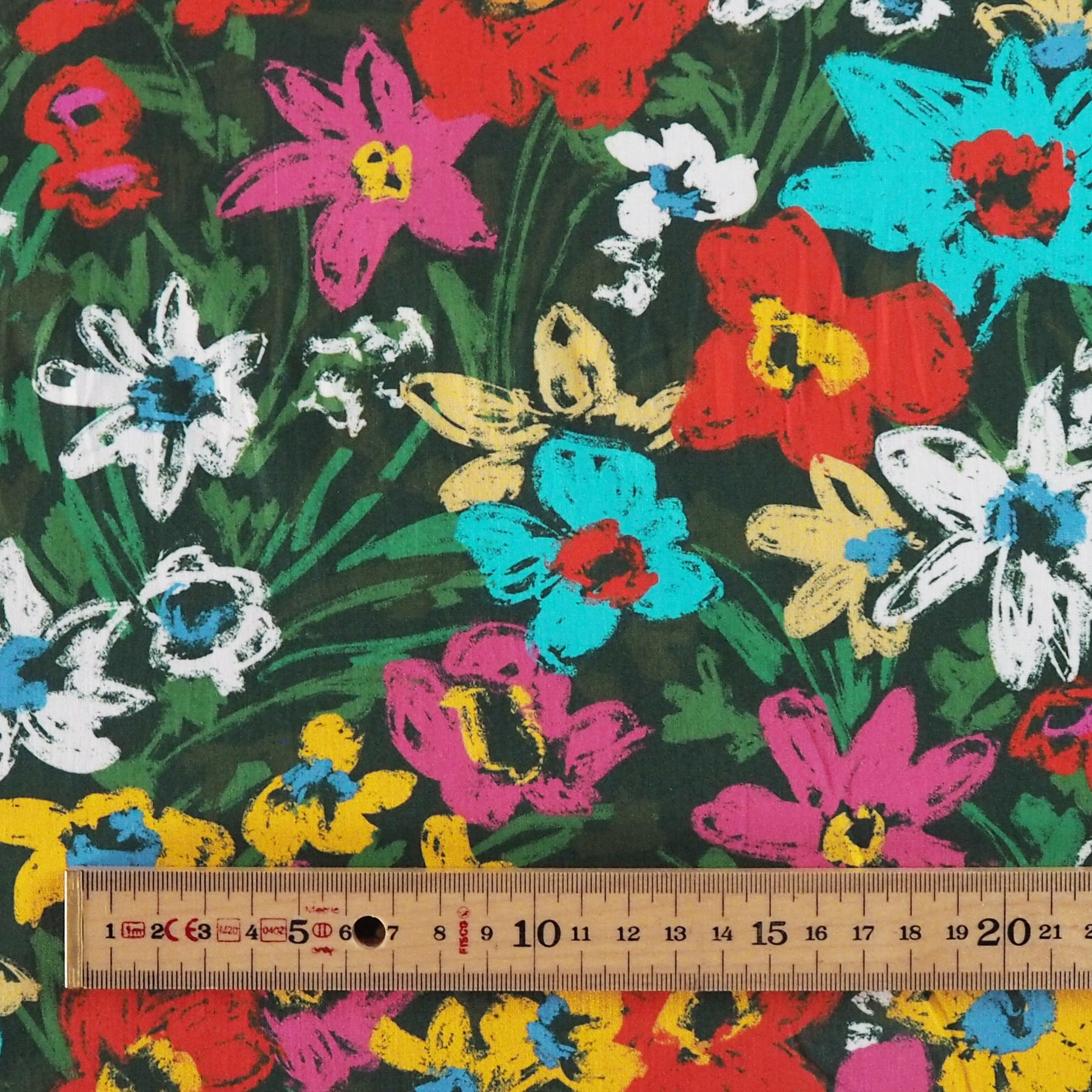 This Fabric Godmother Firle Floral Green Cotton Lawn Fabric features a beautiful, sketchy floral design in gorgeous colours on a deep green background. This is a superfine cotton lawn with fantastic colour quality and a beautiful crisp finish.