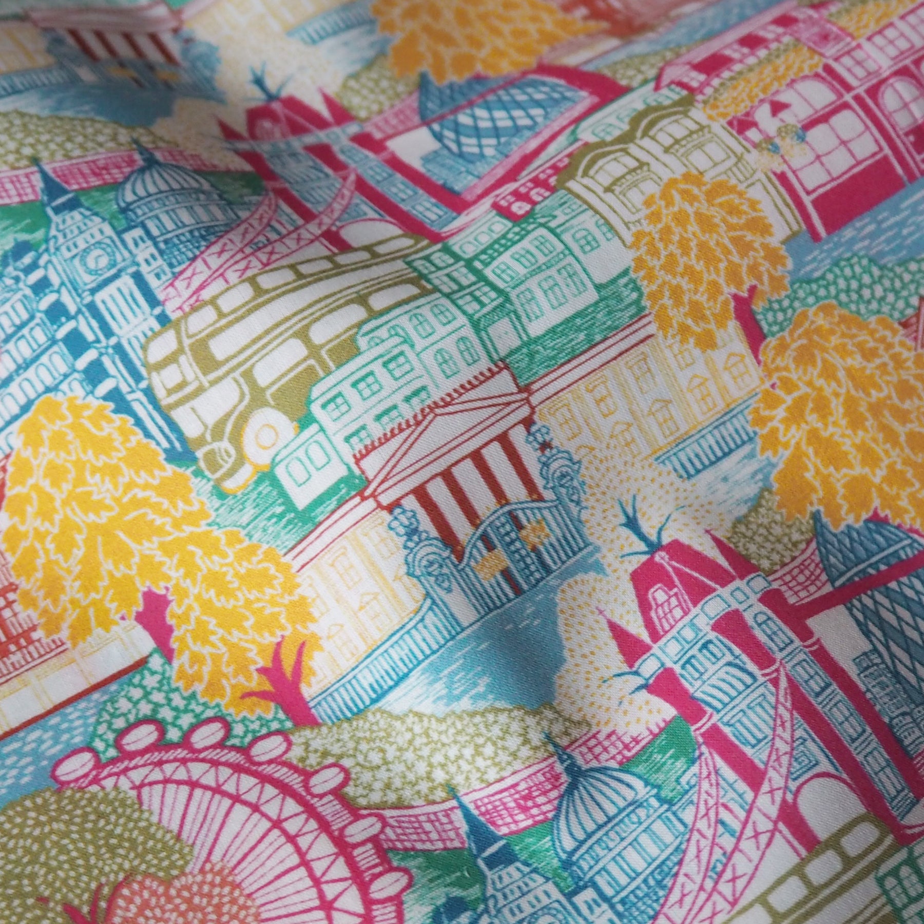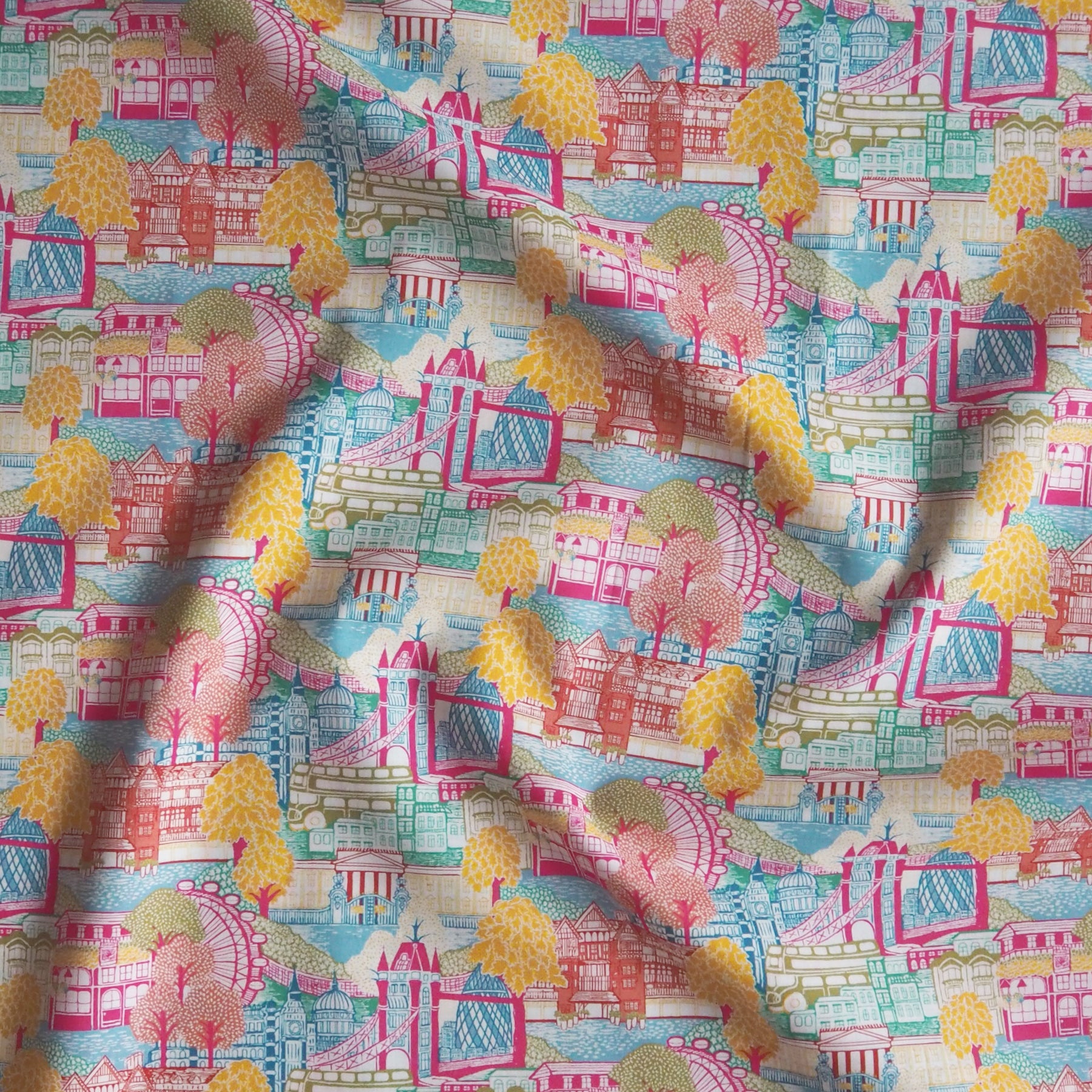 This Liberty Capital Views A Organic Tana Lawn Cotton Fabric features a snapshot of London, presented in a beautifully illustrated patchwork adorned with the iconic architecture of London interspersed with trees.
