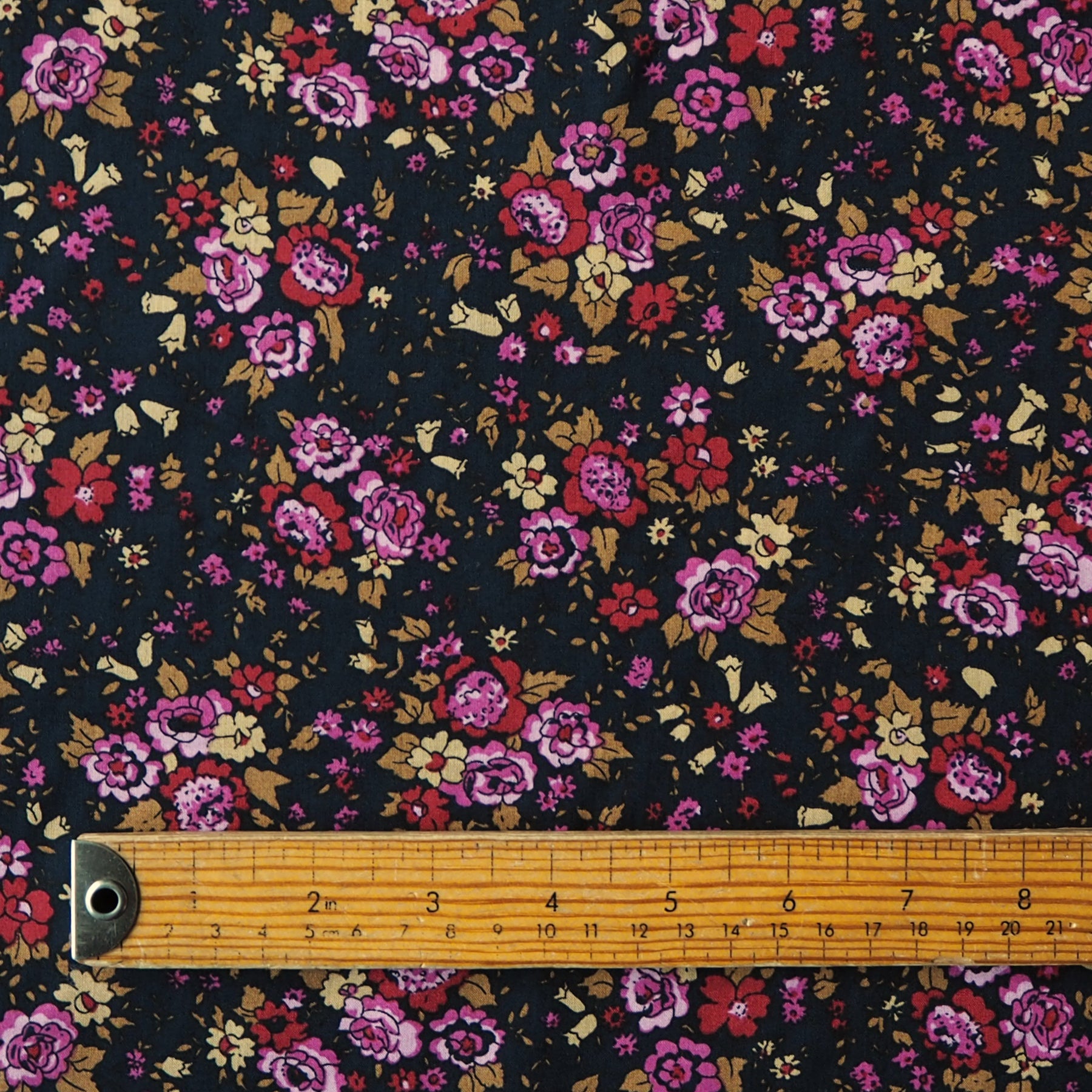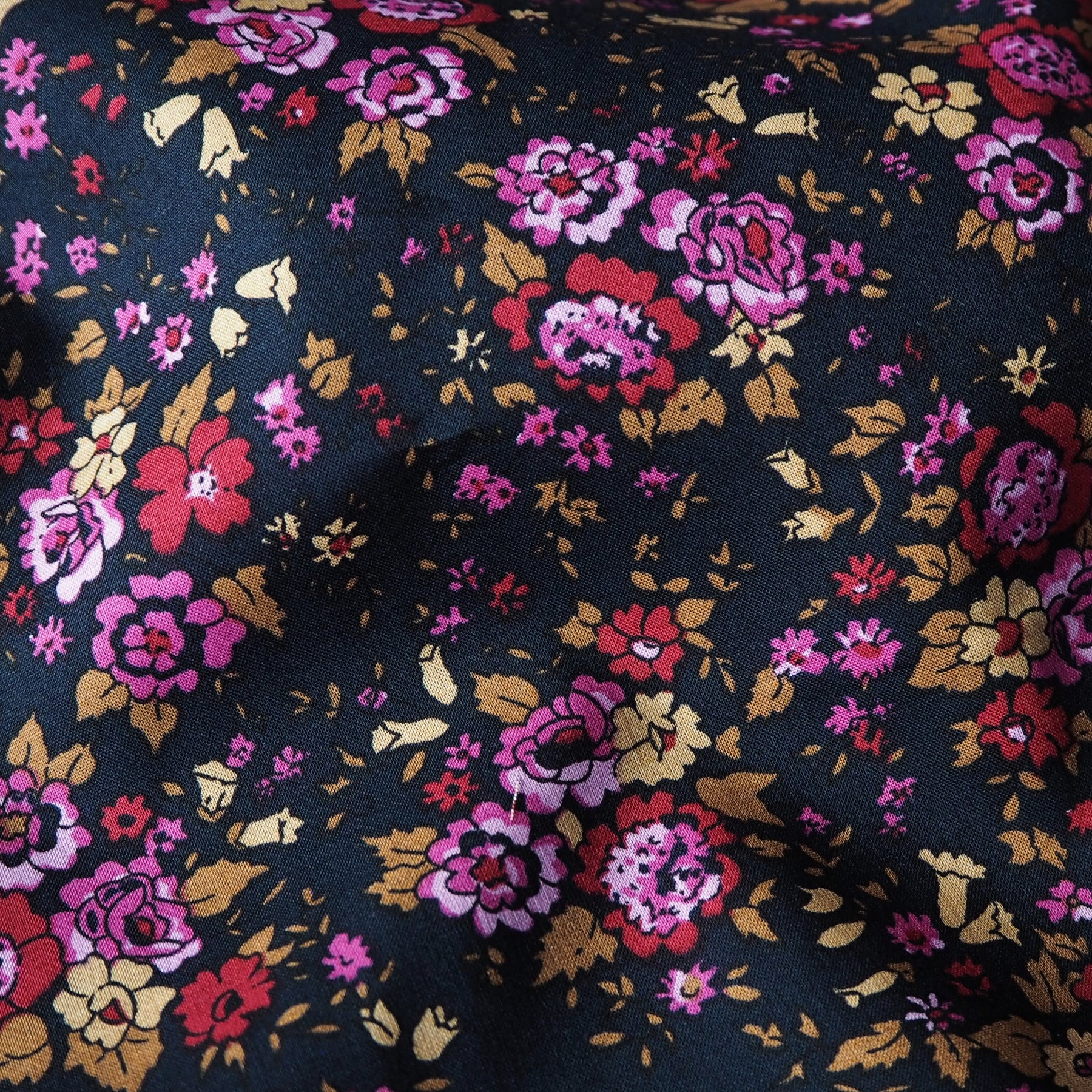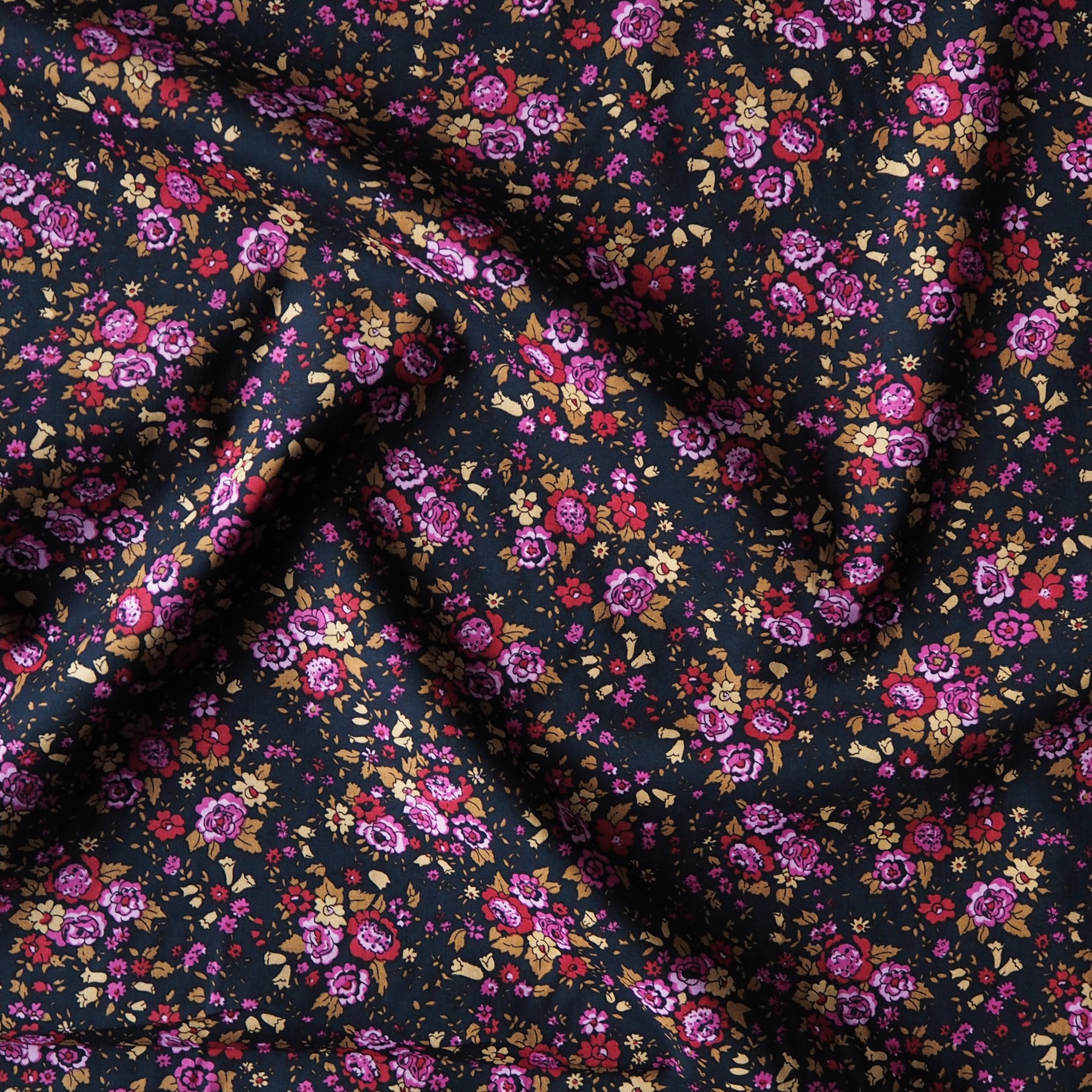 This Midnight Blooms Cotton Poplin Fabric features a pretty ditsy, vintage inspired floral design across a very deep navy background. This lightweight cotton poplin fabric is lovely to both sew and wear.